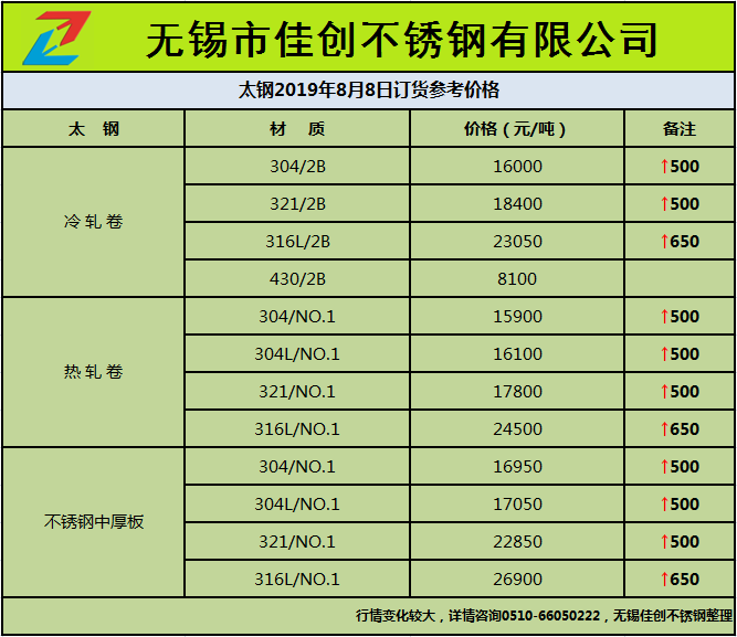 倫鎳表象強(qiáng)勢,鋼廠也不甘落后,早間誠德開盤!與7月30號相比,304漲750,316漲850;指導(dǎo)價太鋼漲500-650,張浦漲200-300。