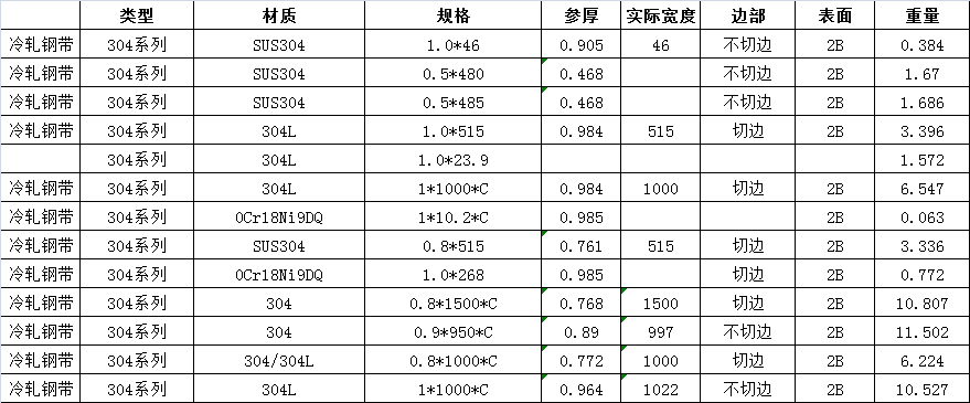部分太鋼不銹鋼帶和張浦不銹鋼帶明細(xì):