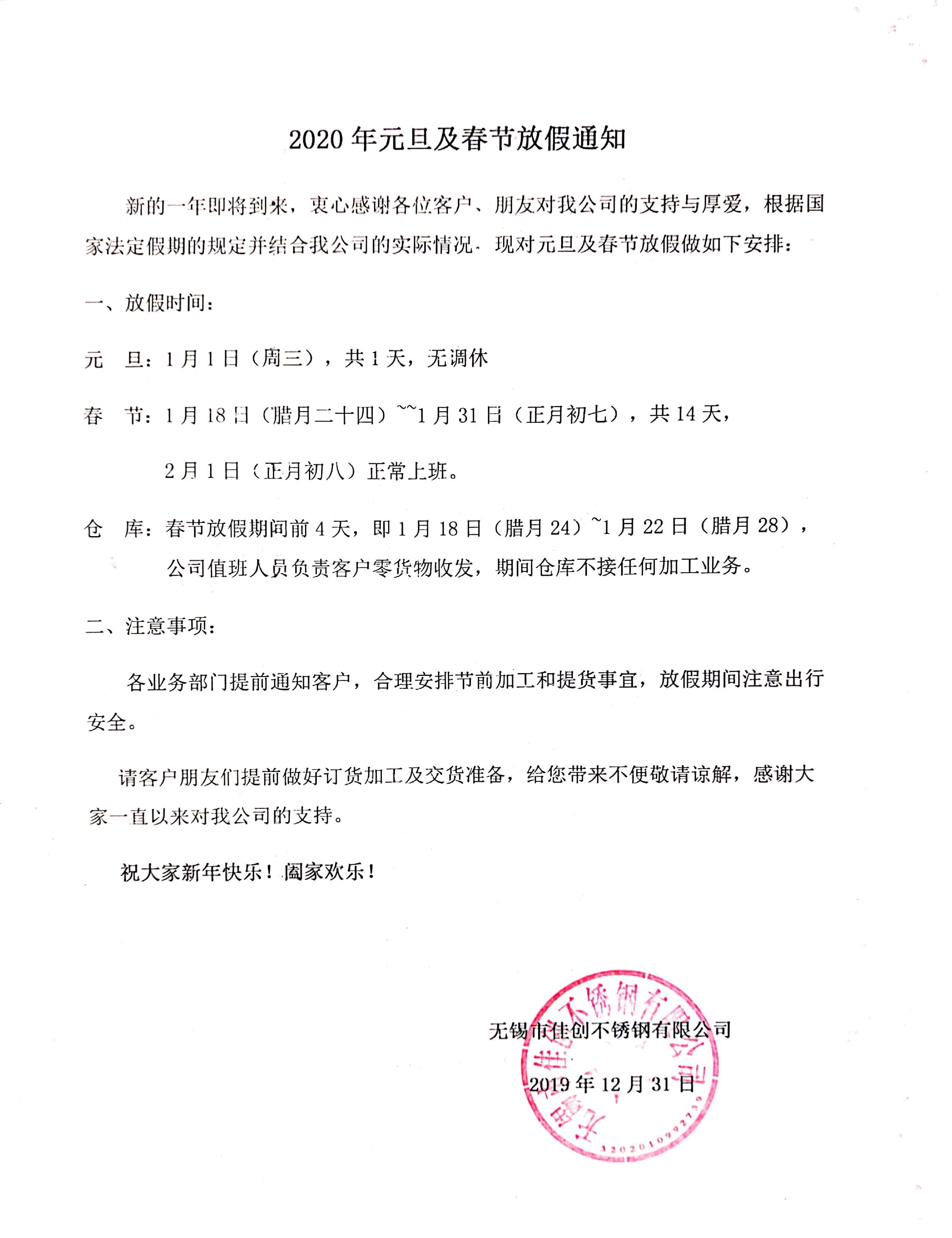 無錫佳創不銹鋼2020年元旦及春節放假通知