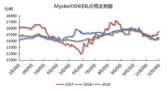回顧2019年,鎳價(jià)變幻莫測(cè),多方面消息刺激,大幅的漲跌波動(dòng)頻繁,尤其是下半年印尼鎳礦多變的政策影響下,大幅高攀之后的深度跌落。2019年1月份304冷軋不銹鋼價(jià)格14100元/噸,3月份上漲到15500元/噸后一路走低到13900元/噸,7月底隨著鎳價(jià)的波動(dòng)不銹鋼價(jià)格一路上揚(yáng)到10月份的16000元/噸,國(guó)慶過(guò)后鎳價(jià)從18500美元一路下跌到最低12900美元/噸,無(wú)錫不銹鋼市場(chǎng)價(jià)格一路下滑到2019年初的水平。