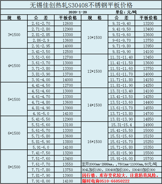 2020年1月20日無錫佳創不銹鋼30408不銹鋼價格