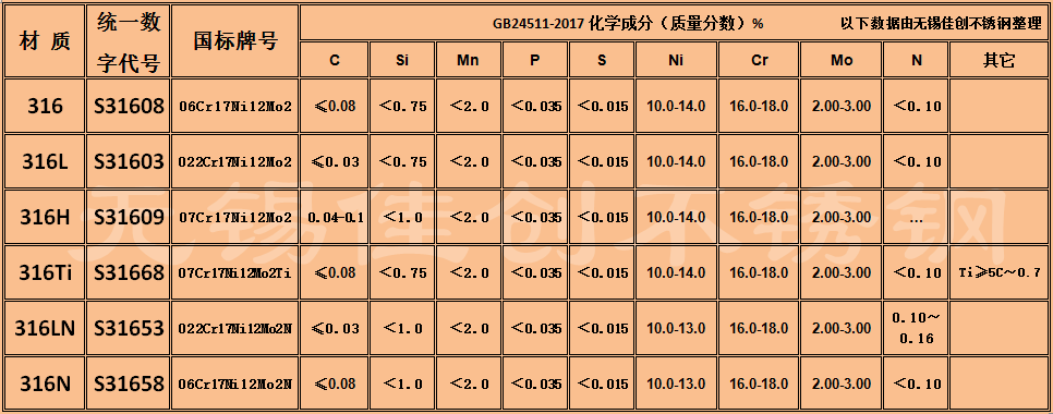 316系不銹鋼GB24511-2017標準下化學成分對比: