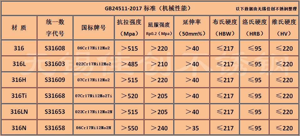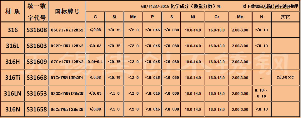 借此機會無錫佳創不銹鋼品質管理人員,從國家相關標準資料里將316不銹鋼、316L不銹鋼、316H不銹鋼、316Ti不銹鋼、316LN不銹鋼、316N不銹鋼的相關化學成分、機械性能摘錄出來列表做對比,大家通過其成分、和性能可以看出還是有一定區別的,在不同的執行標準下,相同的牌號也會有不同的成分要求和不同的性能要求: