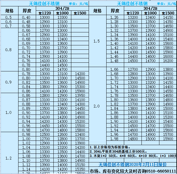 2020年2月11日無錫不銹鋼市場304不銹鋼板價格: